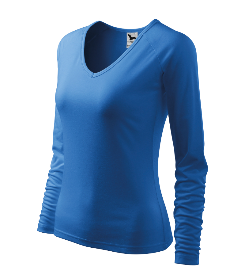 Koszulka damska ELEGANCE127 to elegancka i stylowa koszulka wykonana z wysokiej jakości bawełny. Koszulka ma dopasowany krój z bocznymi szwami, dekolt w kształcie litery V wykończony materiałem wierzchnim i długie raglowane rękawy. Koszulka jest dostępna w różnych kolorach i rozmiarach, a także z możliwością naszycia własnego nadruku.